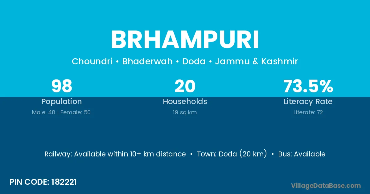 Doda (20 km) is the nearest town to Brhampuri village for major economic activities and is located approximately 20 km away.