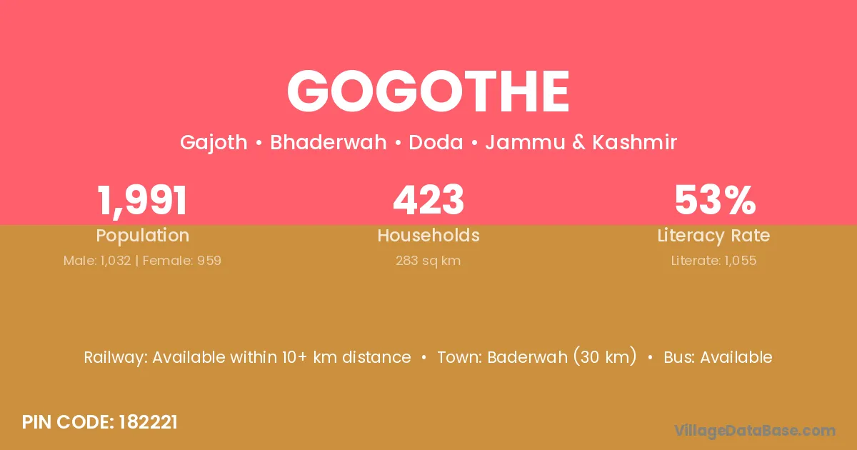 Baderwah (30 km) is the nearest town to Gogothe village for major economic activities and is located approximately 30 km away.