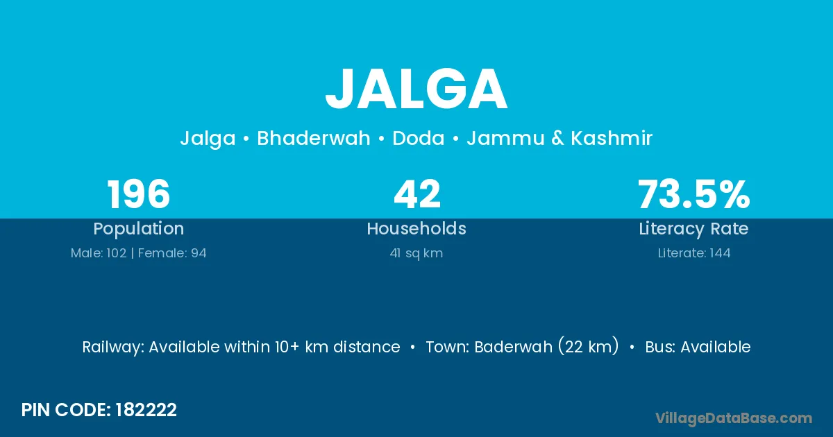 Baderwah (22 km) is the nearest town to Jalga village for major economic activities and is located approximately 22 km away.