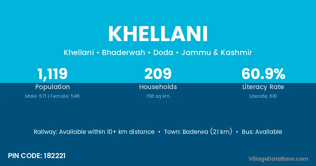 Baderwa (21 km) is the nearest town to Khellani village for major economic activities and is located approximately 21 km away.