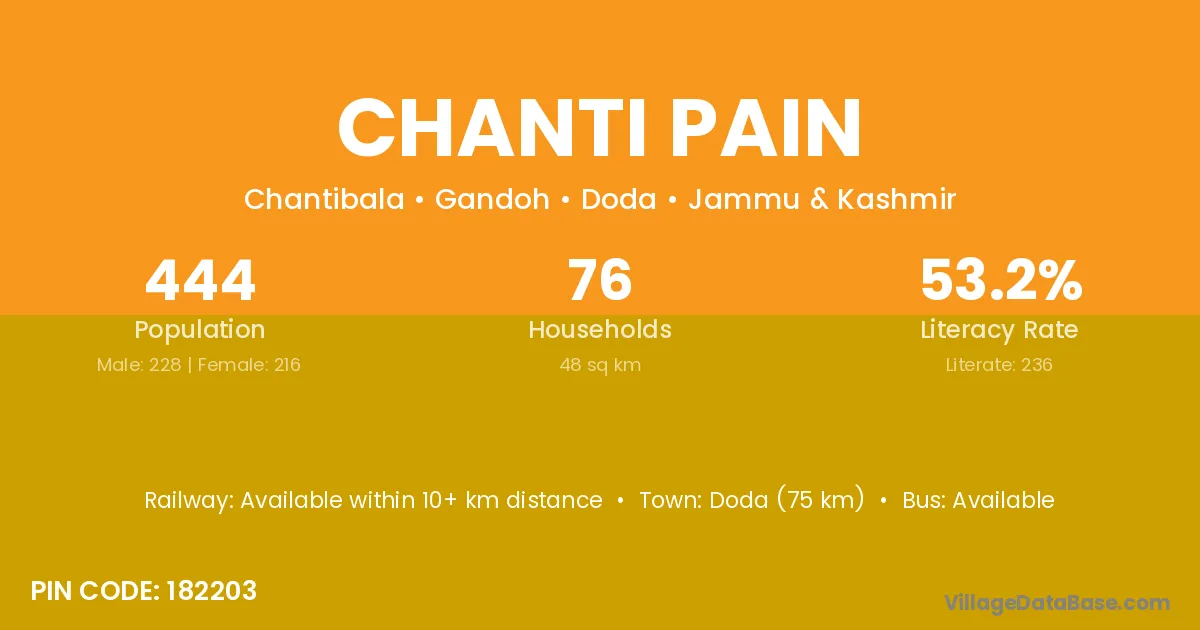 Doda (75 km) is the nearest town to Chanti Pain village for major economic activities and is located approximately 75 km away.
