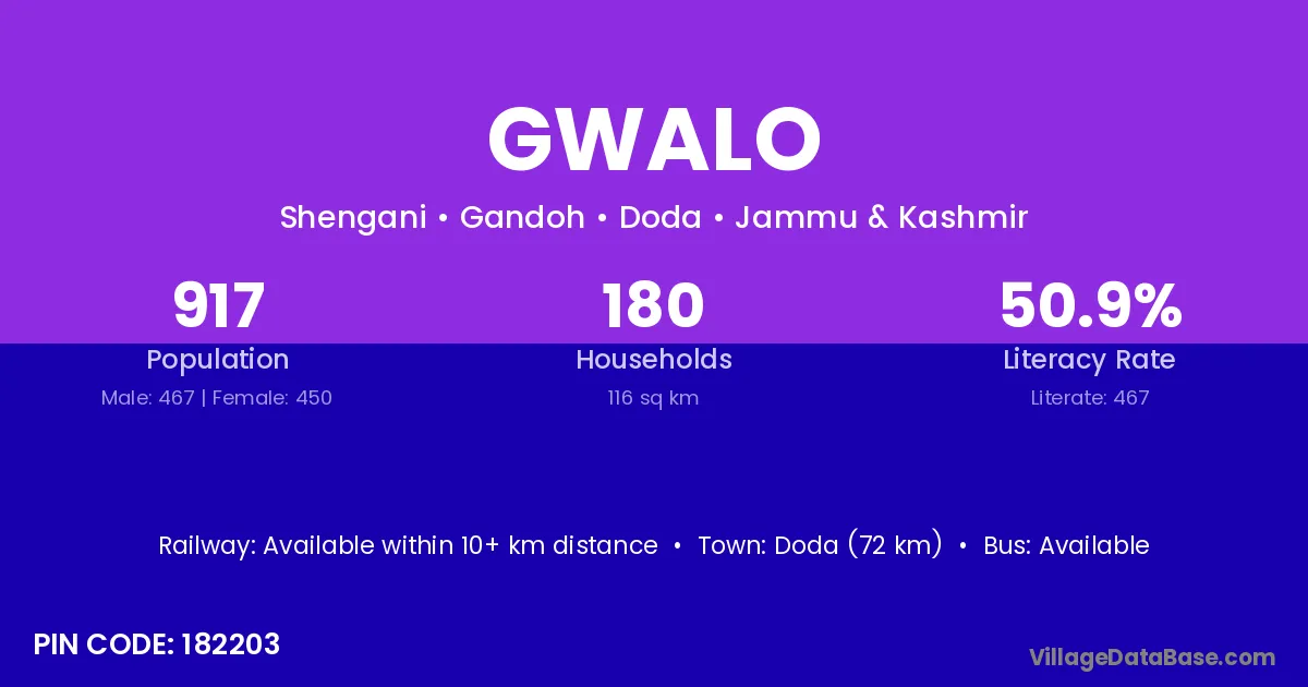 Doda (72 km) is the nearest town to Gwalo village for major economic activities and is located approximately 72 km away.