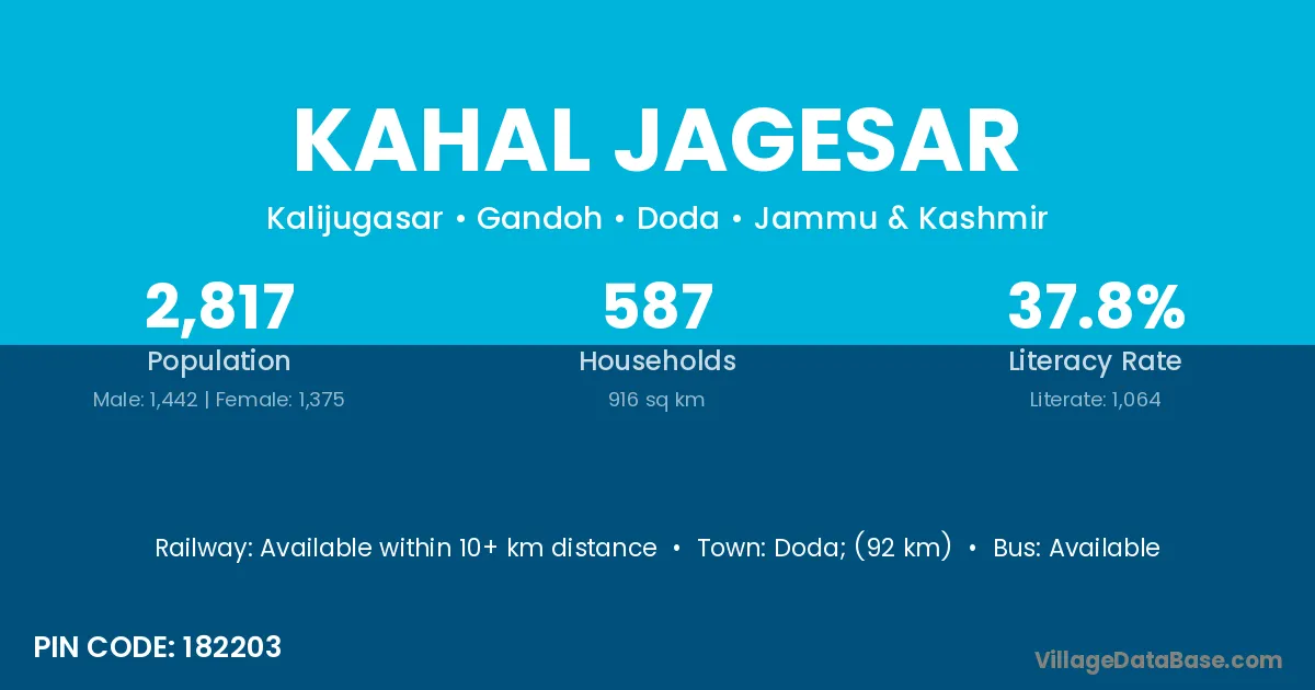 Doda; (92 km) is the nearest town to Kahal Jagesar village for major economic activities and is located approximately 92 km away.