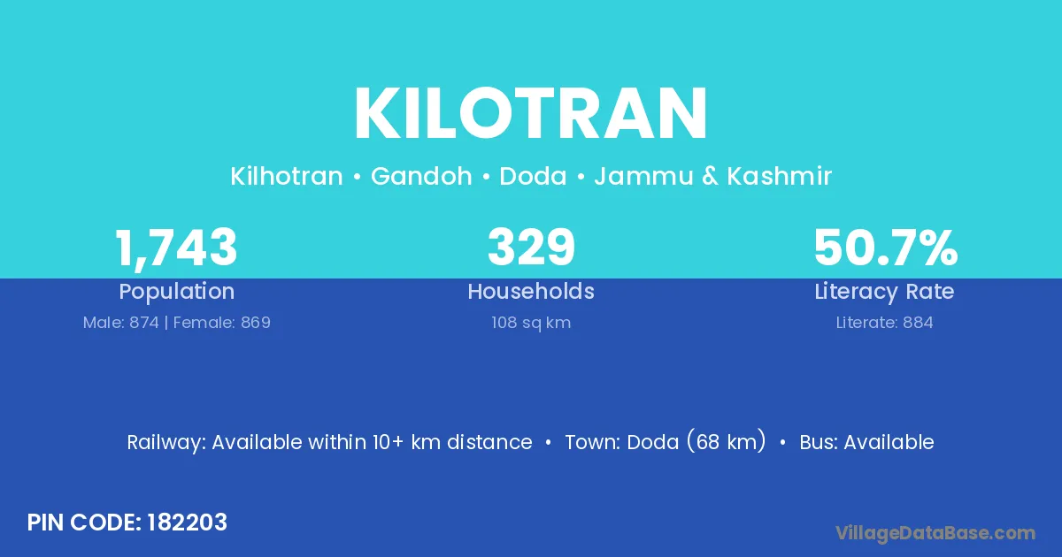 Doda (68 km) is the nearest town to Kilotran village for major economic activities and is located approximately 68 km away.