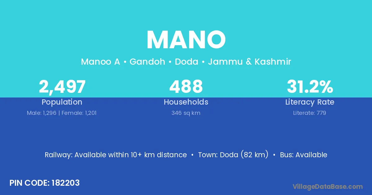 Doda (82 km) is the nearest town to Mano village for major economic activities and is located approximately 82 km away.