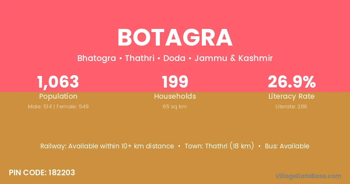 Thathri (18 km) is the nearest town to Botagra village for major economic activities and is located approximately 18 km away.