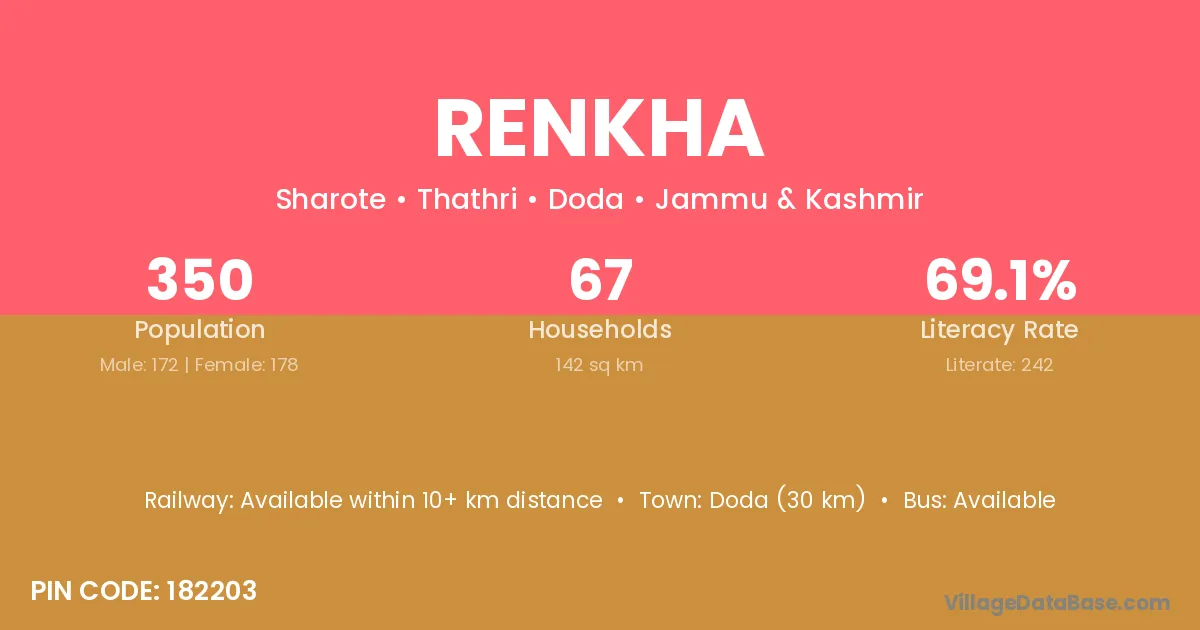 Renkha village has a total population of 350 people, of which 172 are males and 178 are females.