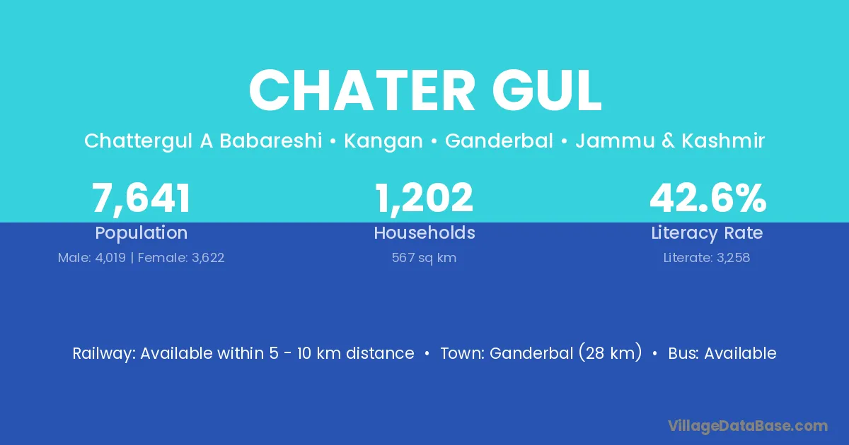 Ganderbal (28 km) is the nearest town to Chater Gul village for major economic activities and is located approximately 28 km away.