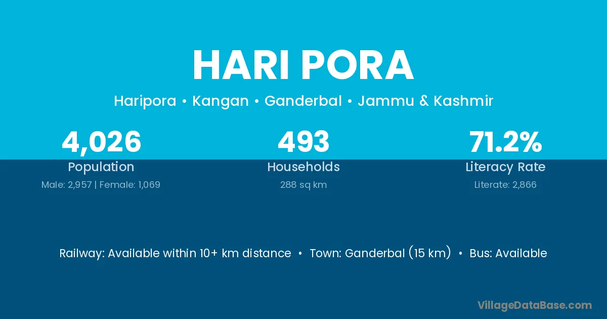 Ganderbal (15 km) is the nearest town to Hari Pora village for major economic activities and is located approximately 15 km away.