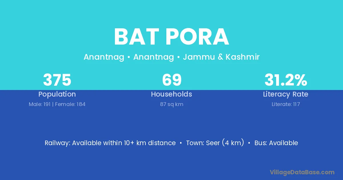 Ganderbal (11 km) is the nearest town to Bat Pora village for major economic activities and is located approximately 11 km away.