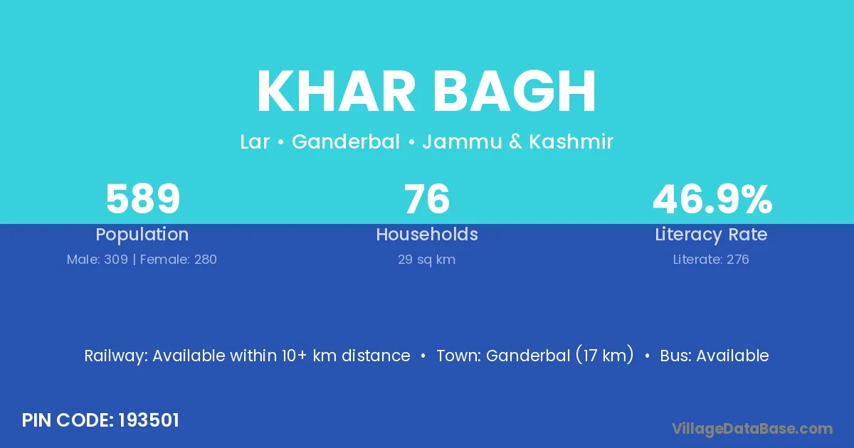Ganderbal (17 km) is the nearest town to Khar Bagh village for major economic activities and is located approximately 17 km away.