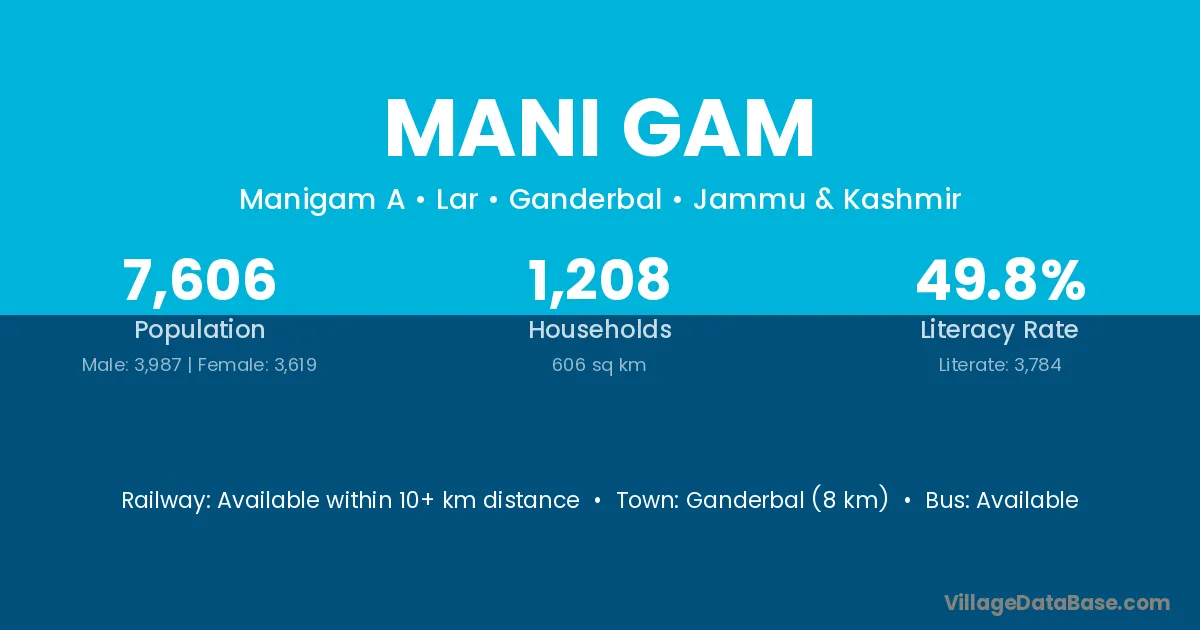 Ganderbal (8 km) is the nearest town to Mani Gam village for major economic activities and is located approximately 8 km away.