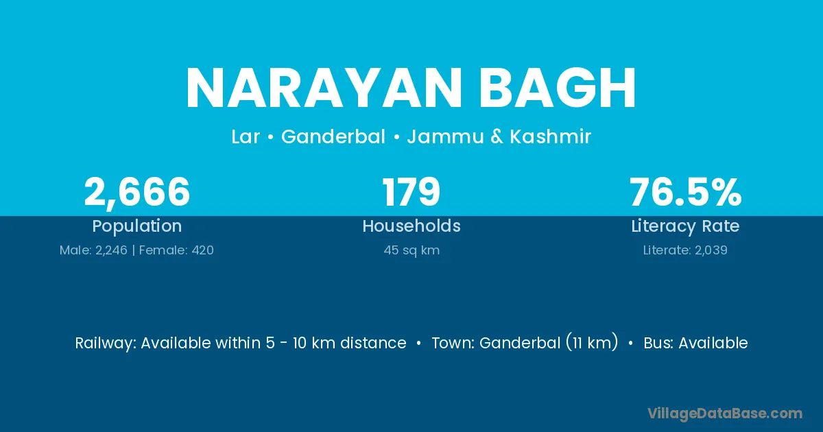 Ganderbal (11 km) is the nearest town to Narayan Bagh village for major economic activities and is located approximately 11 km away.