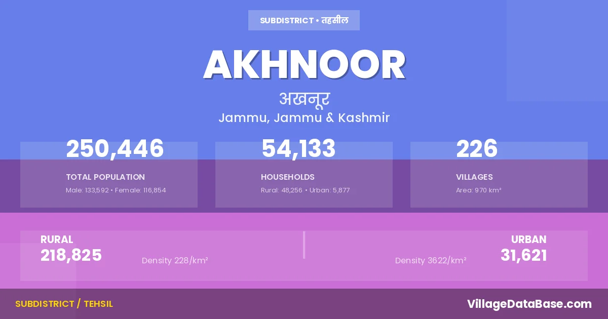 According to the 2011 census The total area of Akhnoor Tehsil is 970 km², with a population of 250446 people. The population density is 258 inhabitants per square kilometre, and there are approximately 54133 houses in the sub district.