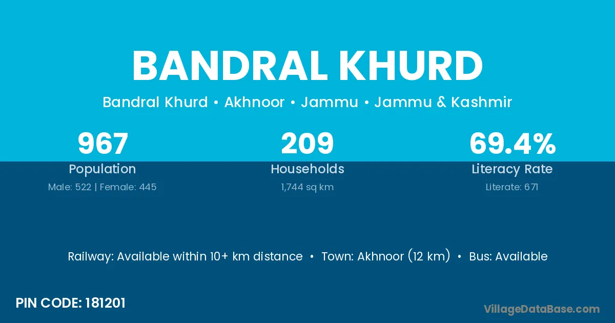 Akhnoor (12 km) is the nearest town to Bandral Khurd village for major economic activities and is located approximately 12 km away.