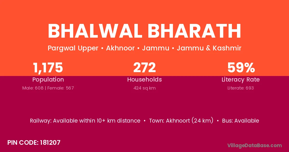 Akhnoort (24 km) is the nearest town to Bhalwal Bharath village for major economic activities and is located approximately 24 km away.