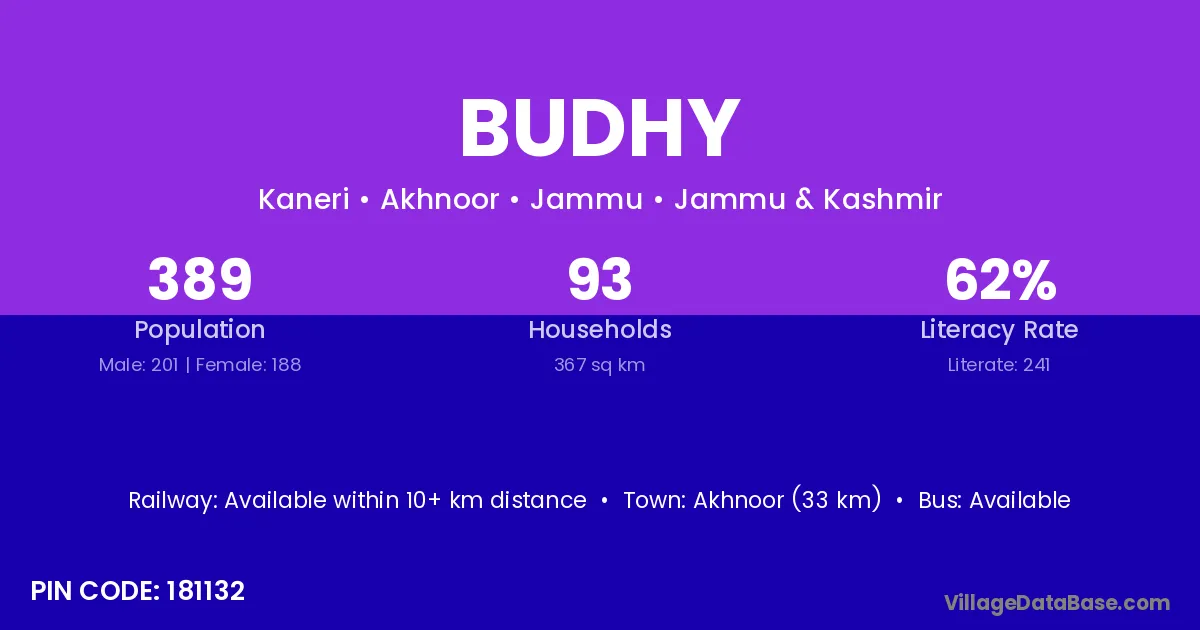 Akhnoor (33 km) is the nearest town to Budhy village for major economic activities and is located approximately 33 km away.