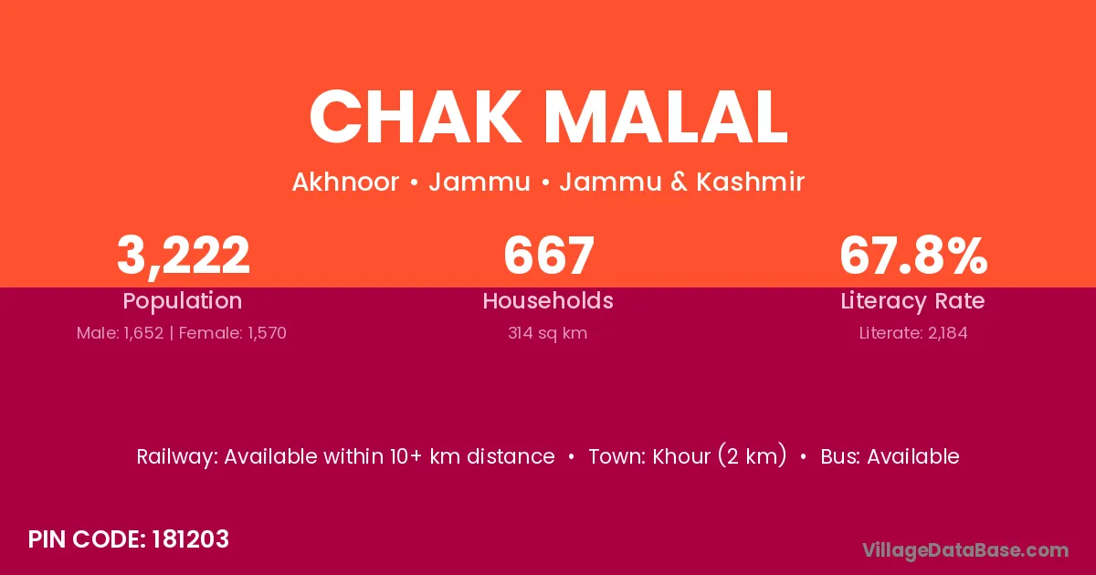Chak Malal village has a total population of 3,222 people, of which 1,652 are males and 1,570 are females.