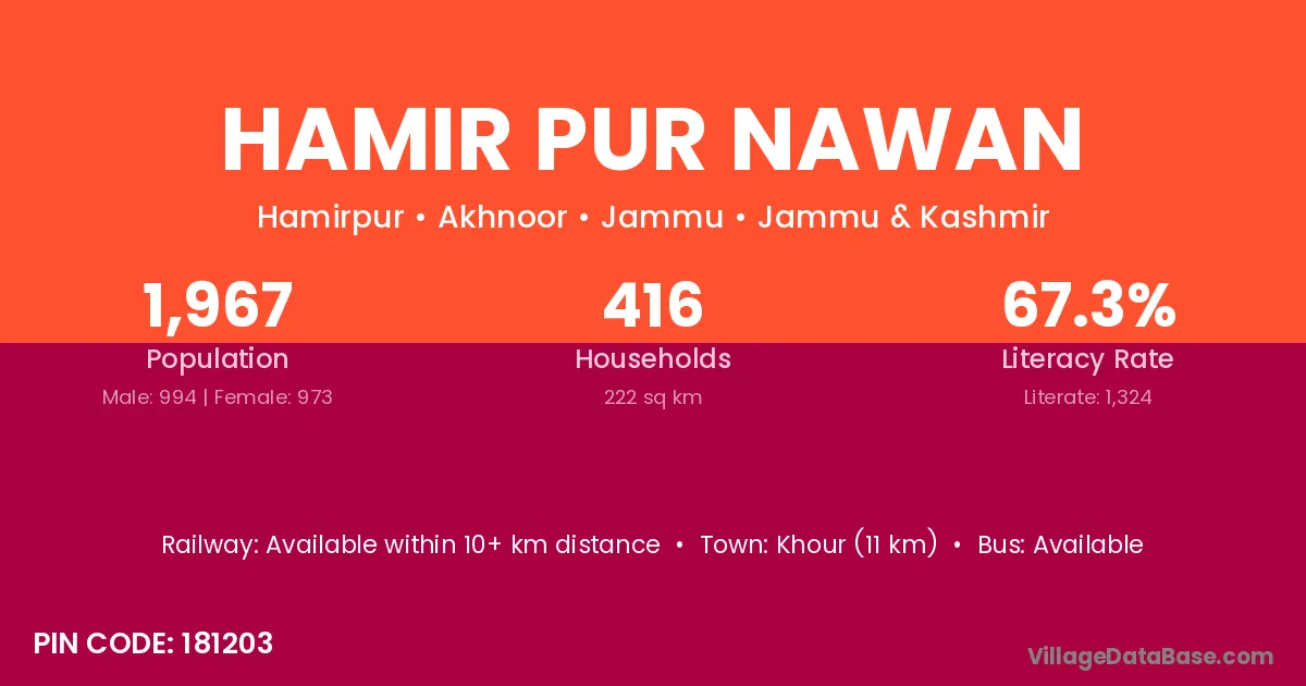 Khour (11 km) is the nearest town to Hamir Pur Nawan village for major economic activities and is located approximately 11 km away.