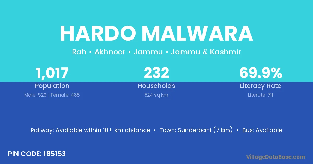 Sunderbani (7 km) is the nearest town to Hardo Malwara village for major economic activities and is located approximately 7 km away.