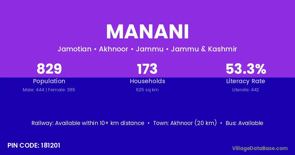 Akhnoor (20 km) is the nearest town to Manani village for major economic activities and is located approximately 20 km away.