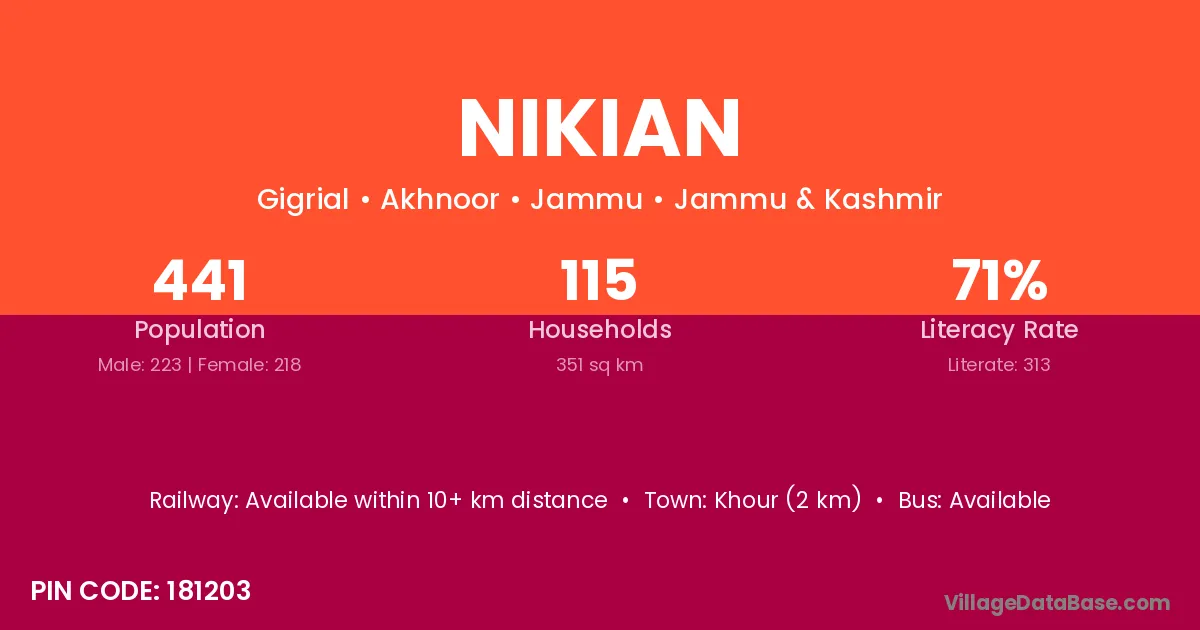 Nikian village has a total population of 441 people, of which 223 are males and 218 are females.