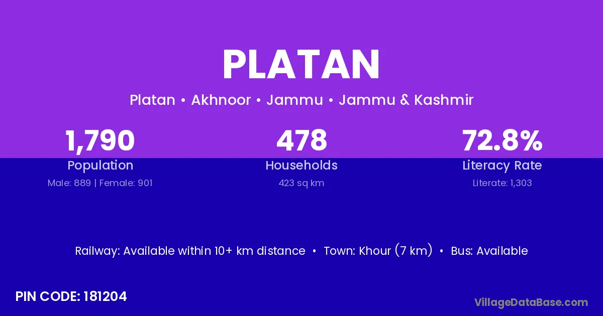 The literacy rate of Platan village is 72.79%. Male literacy stands at 77.84% and female literacy at 67.81%.