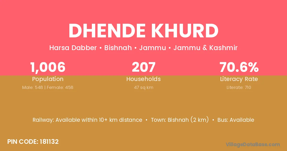 Bishnah (2 km) is the nearest town to Dhende Khurd village for major economic activities and is located approximately 2 km away.