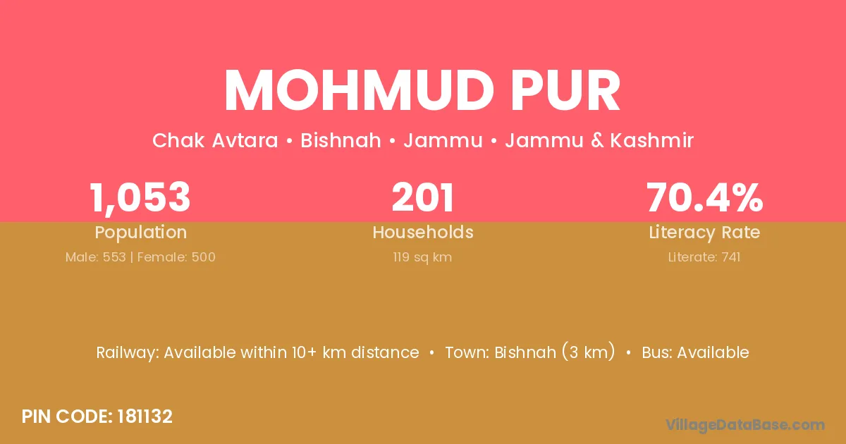 Bishnah (3 km) is the nearest town to Mohmud Pur village for major economic activities and is located approximately 3 km away.