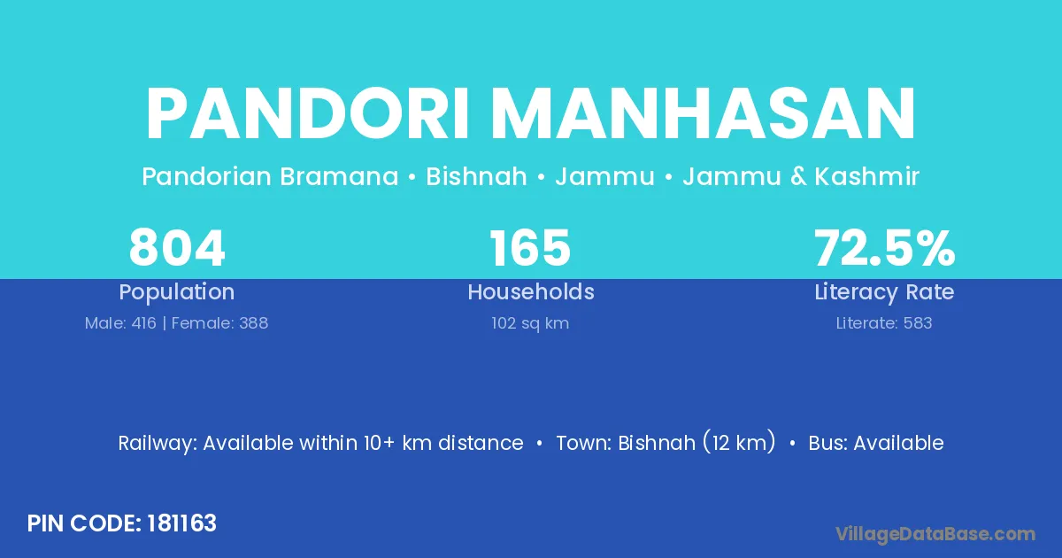 Bishnah (12 km) is the nearest town to Pandori Manhasan village for major economic activities and is located approximately 12 km away.