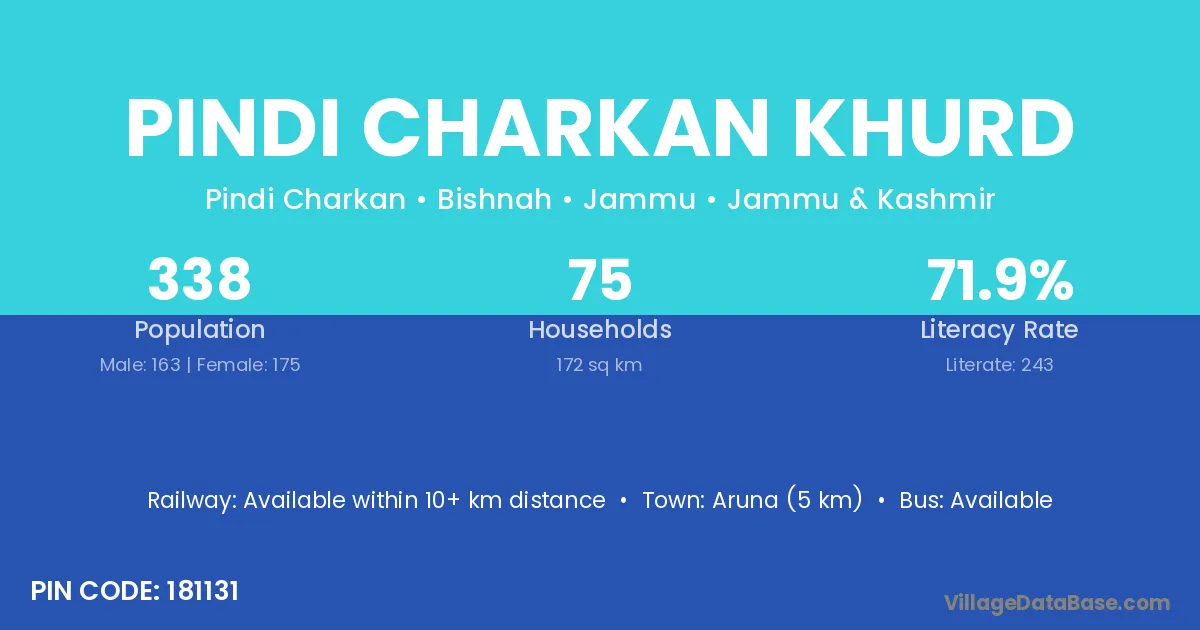 Pindi Charkan Khurd village has a total population of 338 people, of which 163 are males and 175 are females.