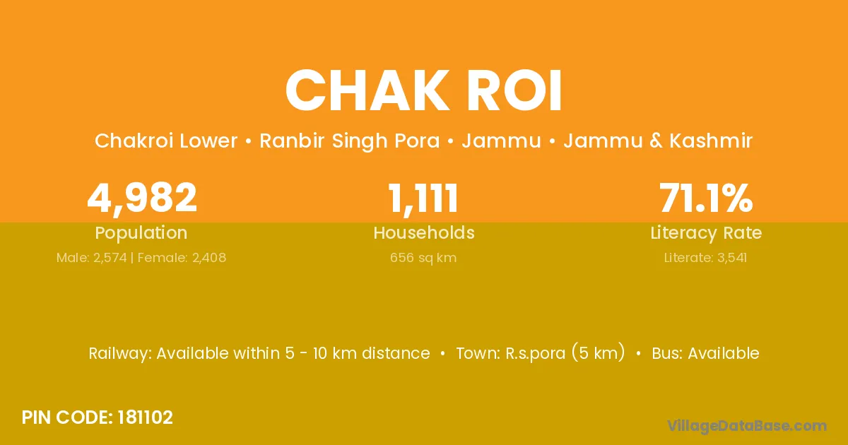 R.s.pora (5 km) is the nearest town to Chak Roi village for major economic activities and is located approximately 5 km away.
