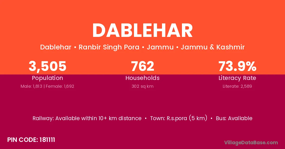 R.s.pora (5 km) is the nearest town to Dablehar village for major economic activities and is located approximately 5 km away.