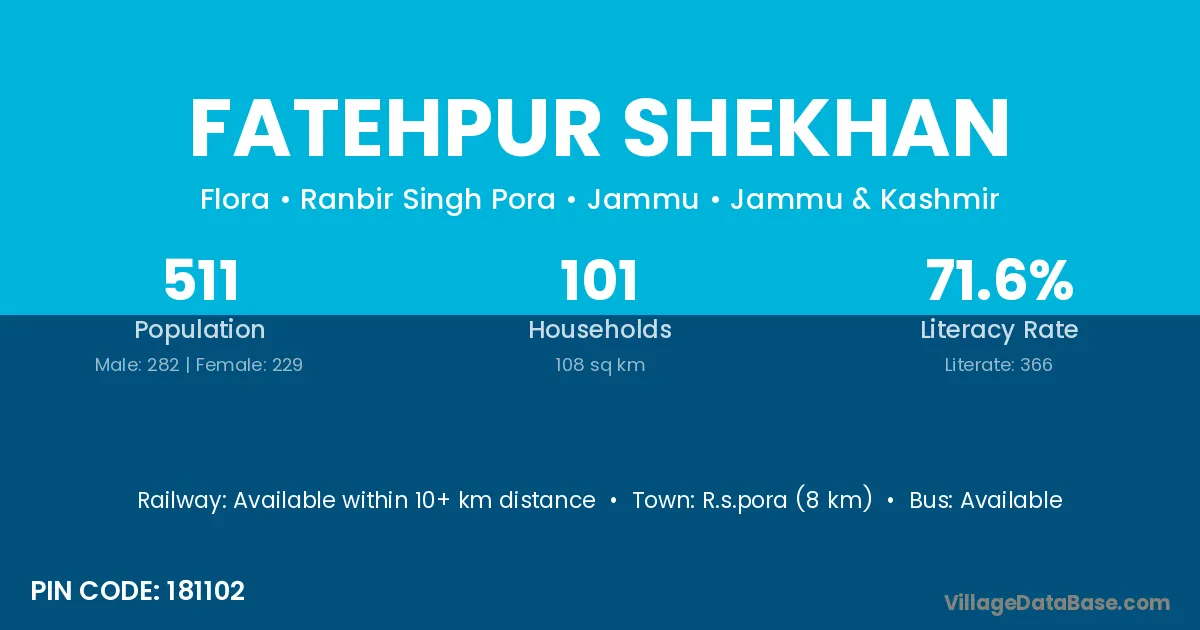 R.s.pora (8 km) is the nearest town to Fatehpur Shekhan village for major economic activities and is located approximately 8 km away.