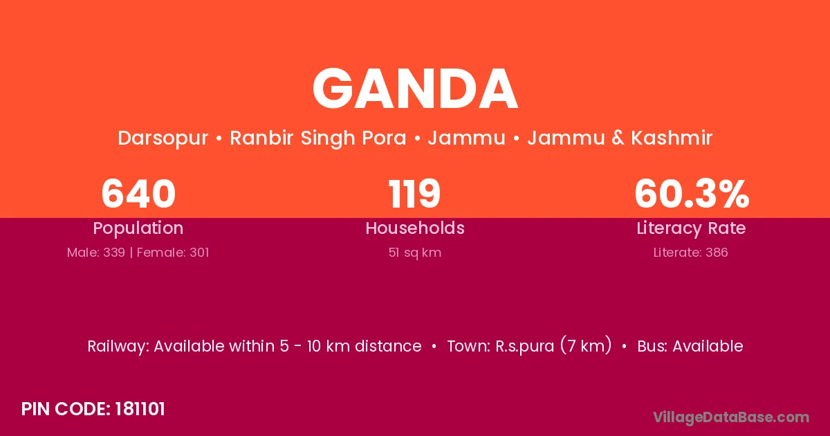 R.s.pura (7 km) is the nearest town to Ganda village for major economic activities and is located approximately 7 km away.