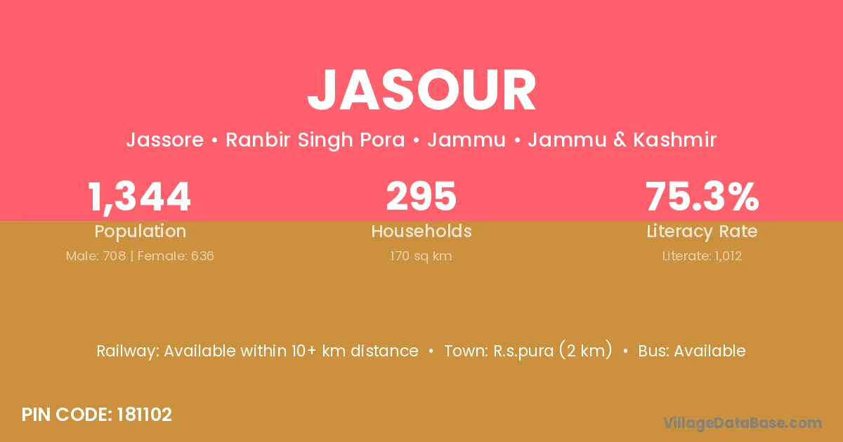 R.s.pura (2 km) is the nearest town to Jasour village for major economic activities and is located approximately 2 km away.