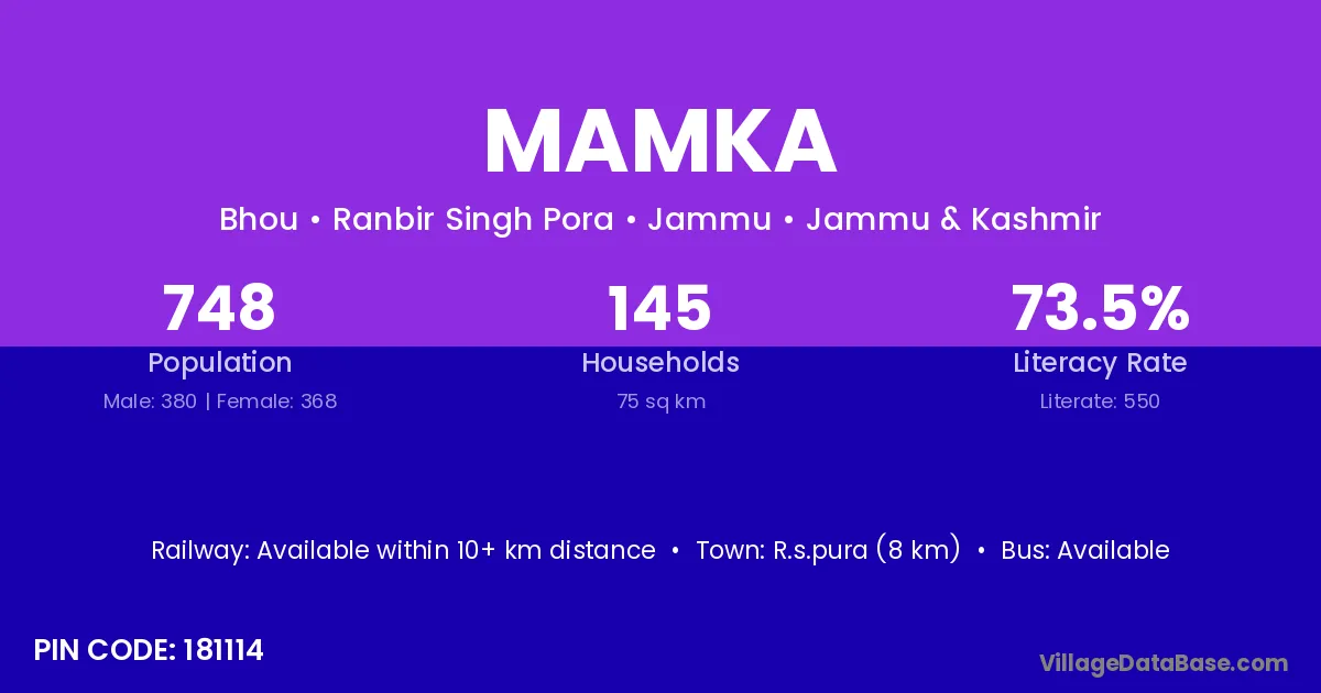 R.s.pura (8 km) is the nearest town to Mamka village for major economic activities and is located approximately 8 km away.