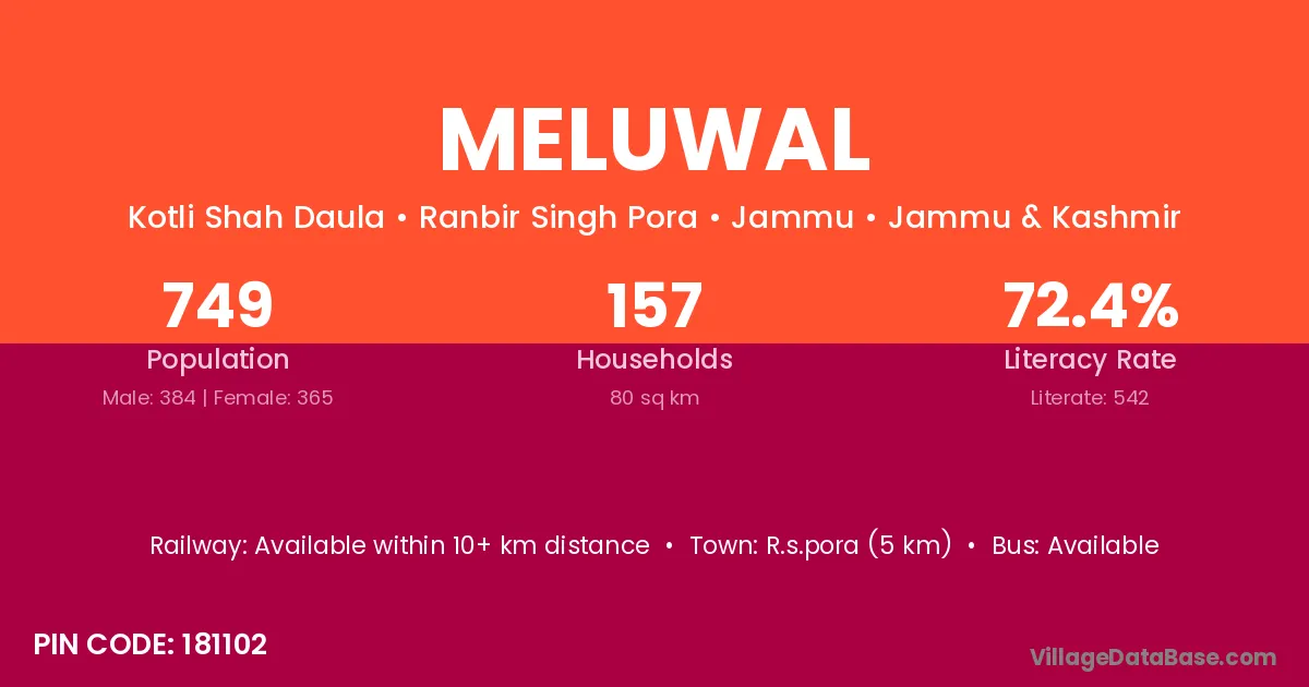 R.s.pora (5 km) is the nearest town to Meluwal village for major economic activities and is located approximately 5 km away.