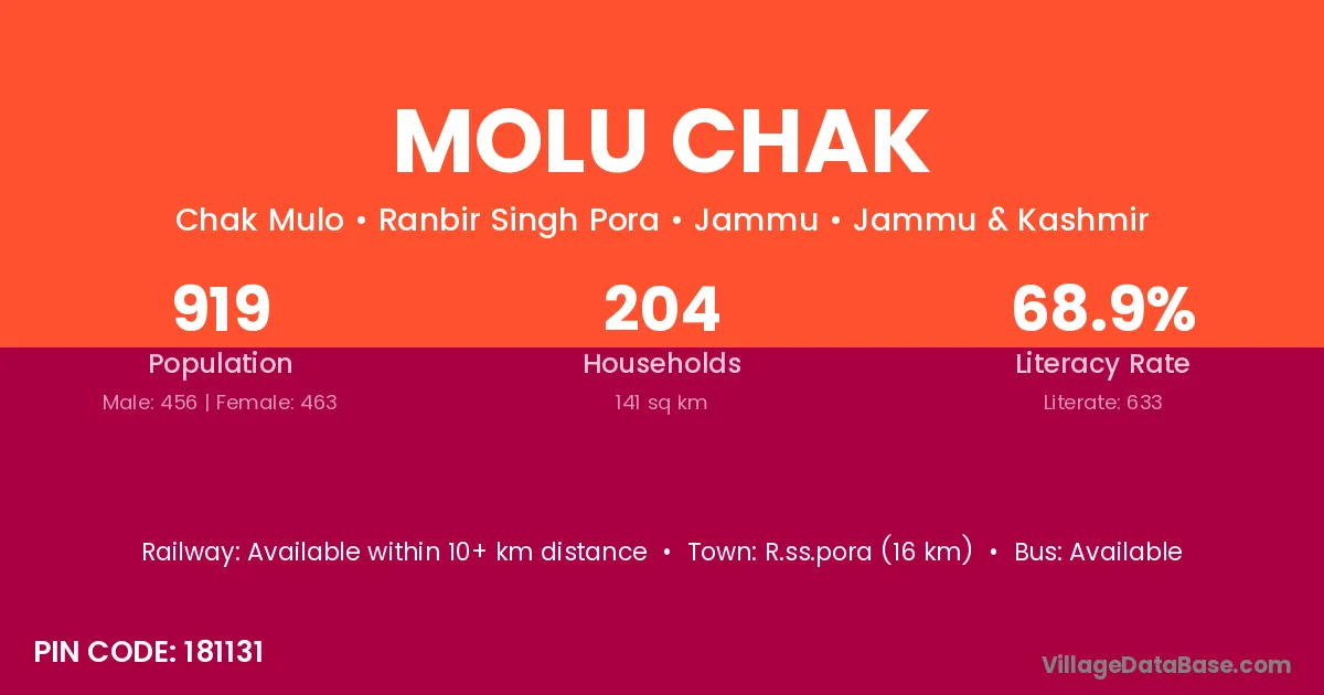 Molu Chak village has a total population of 919 people, of which 456 are males and 463 are females.