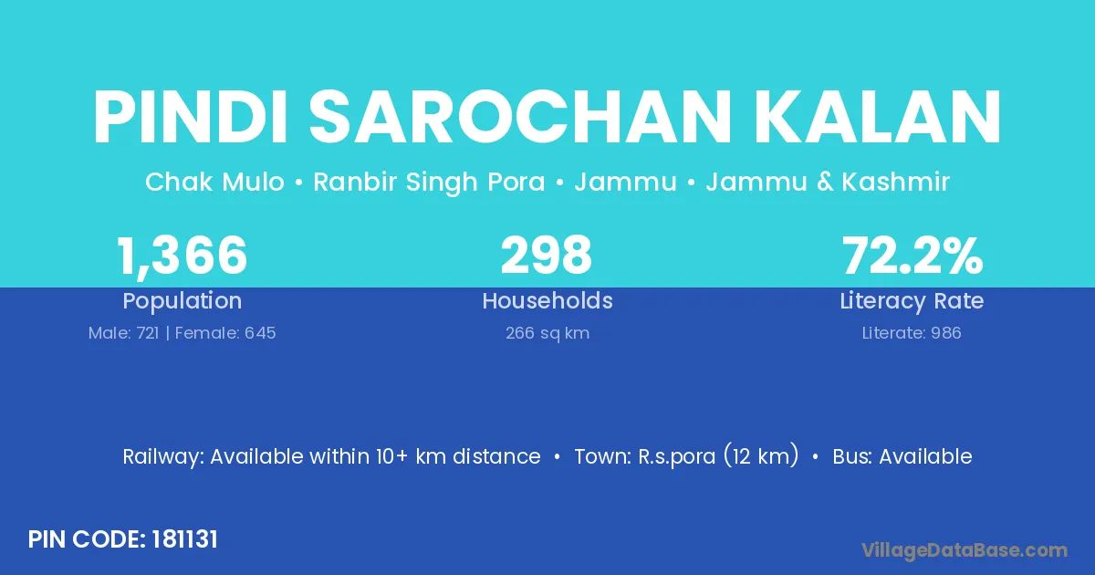 R.s.pora (12 km) is the nearest town to Pindi Sarochan Kalan village for major economic activities and is located approximately 12 km away.