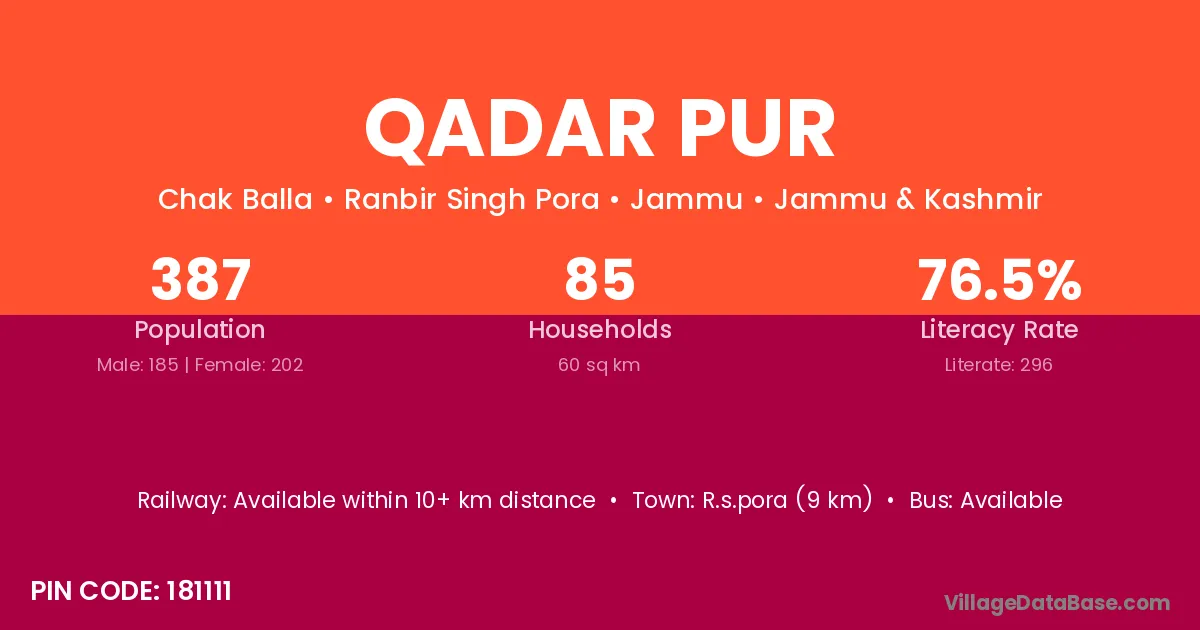 R.s.pora (9 km) is the nearest town to Qadar Pur village for major economic activities and is located approximately 9 km away.