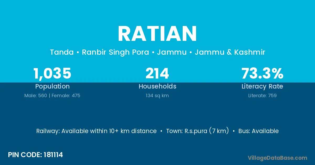 R.s.pura (7 km) is the nearest town to Ratian village for major economic activities and is located approximately 7 km away.