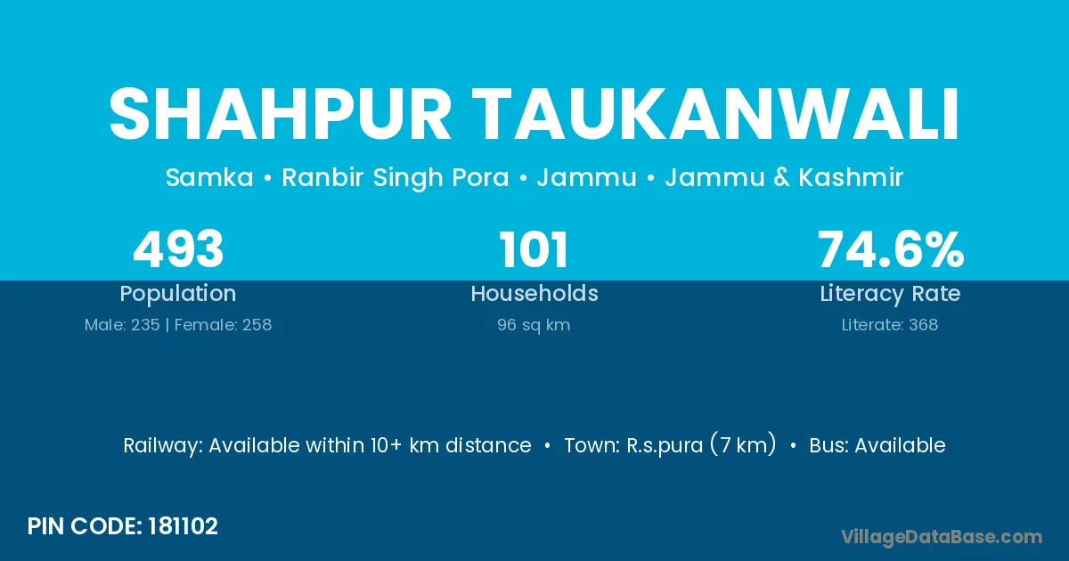 R.s.pura (7 km) is the nearest town to Shahpur Taukanwali village for major economic activities and is located approximately 7 km away.