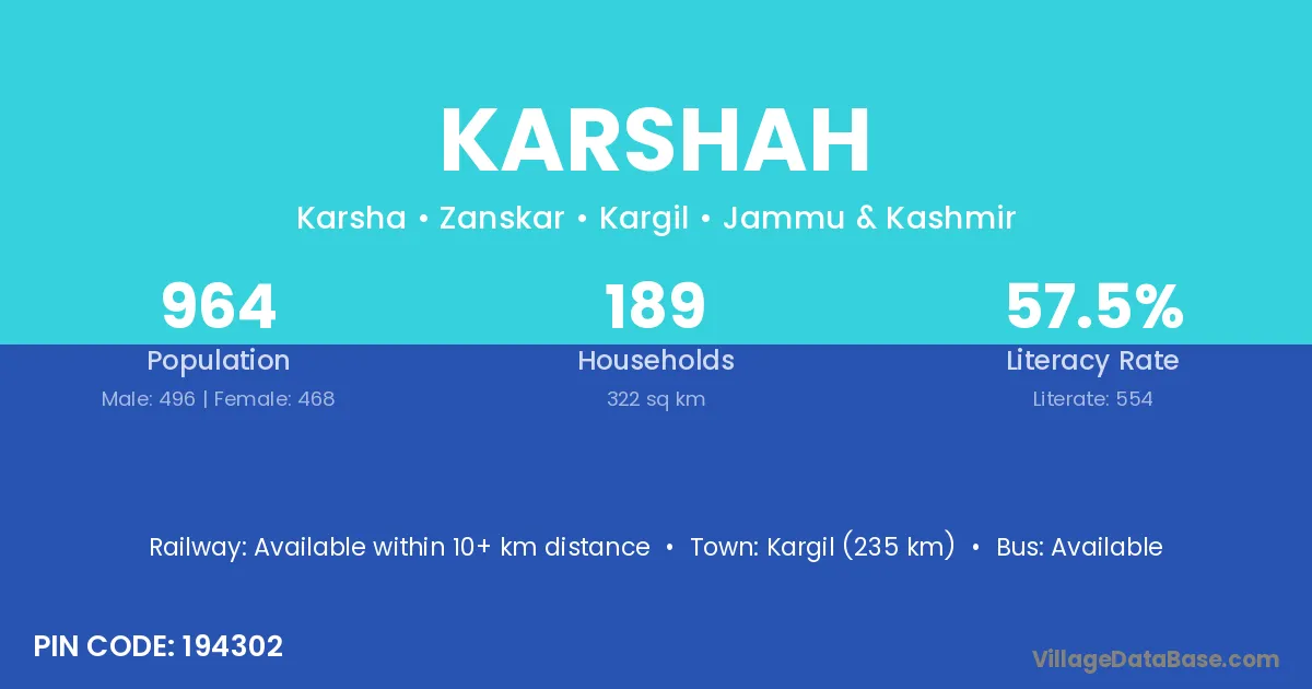 Kargil (235 km) is the nearest town to Karshah village for major economic activities and is located approximately 235 km away.