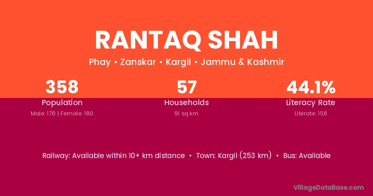 Kargil (253 km) is the nearest town to Rantaq Shah village for major economic activities and is located approximately 253 km away.