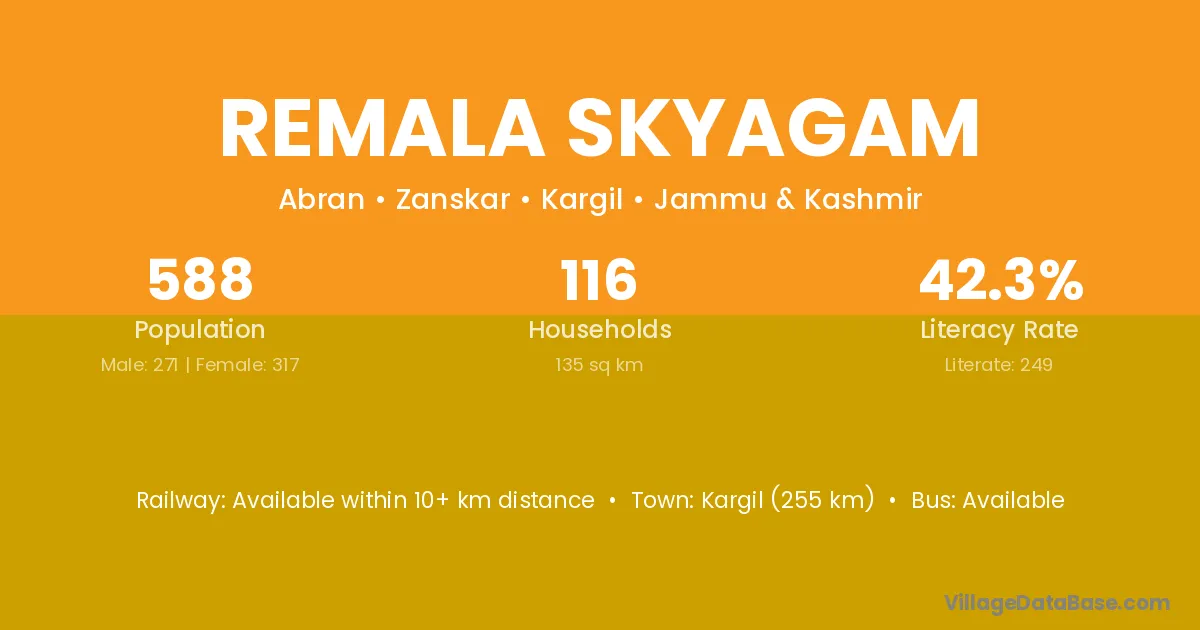 Kargil (255 km) is the nearest town to Remala Skyagam village for major economic activities and is located approximately 255 km away.