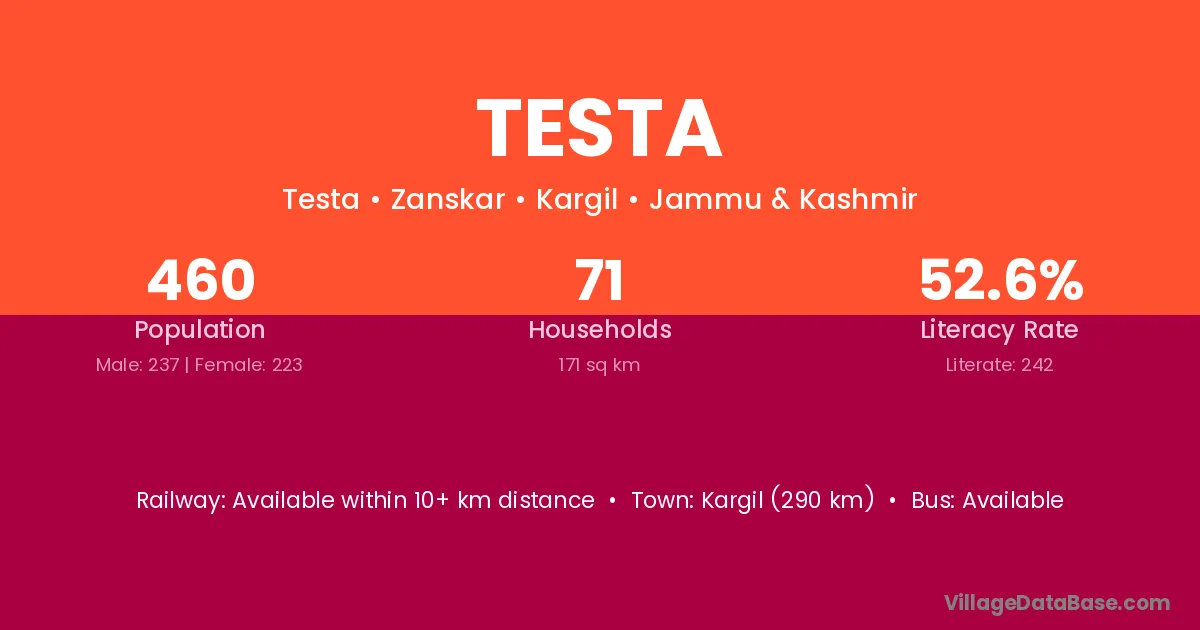 Kargil (290 km) is the nearest town to Testa village for major economic activities and is located approximately 290 km away.