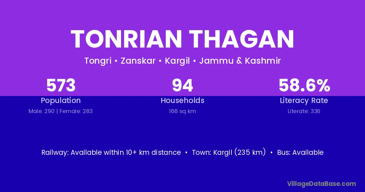 Kargil (235 km) is the nearest town to Tonrian Thagan village for major economic activities and is located approximately 235 km away.