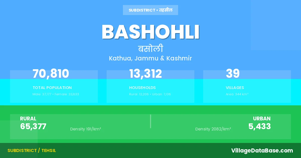 According to the 2011 census The total area of Bashohli Tehsil is 344 km², with a population of 70810 people. The population density is 206 inhabitants per square kilometre, and there are approximately 13312 houses in the sub district.