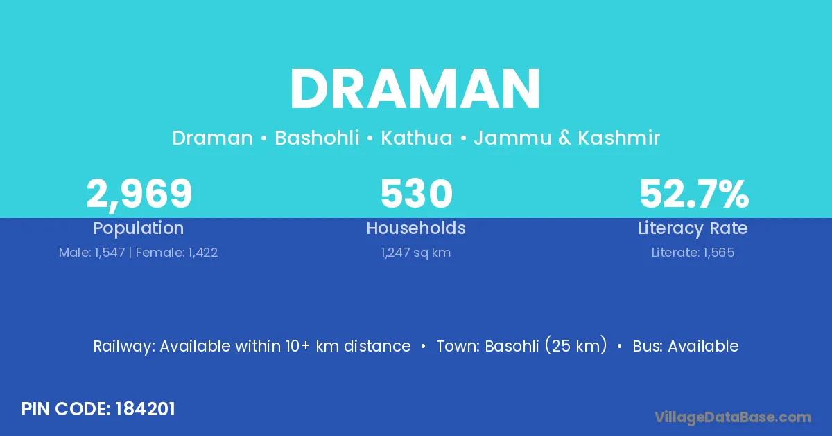 Basohli (25 km) is the nearest town to Draman village for major economic activities and is located approximately 25 km away.